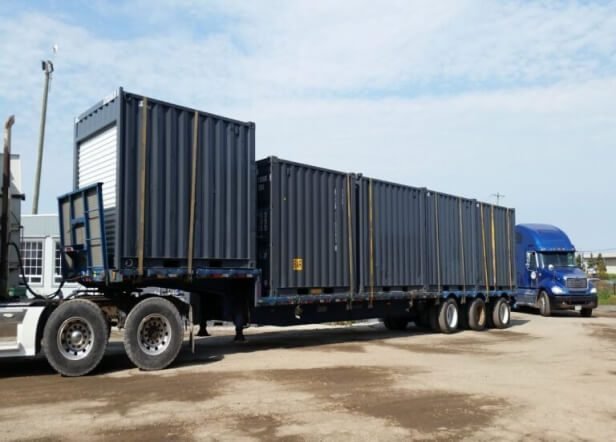 Versandcontainer werden per Lkw angeliefert. Die Größe des Containers und der Anlieferungsort bestimmen, welche Art von Lkw verwendet wird. Die meisten Versandcontainer werden auf Kippanhängern angeliefert. Diese Anhänger fahren zurück und kippen den Container ohne Hilfe in die gewünschte Position.